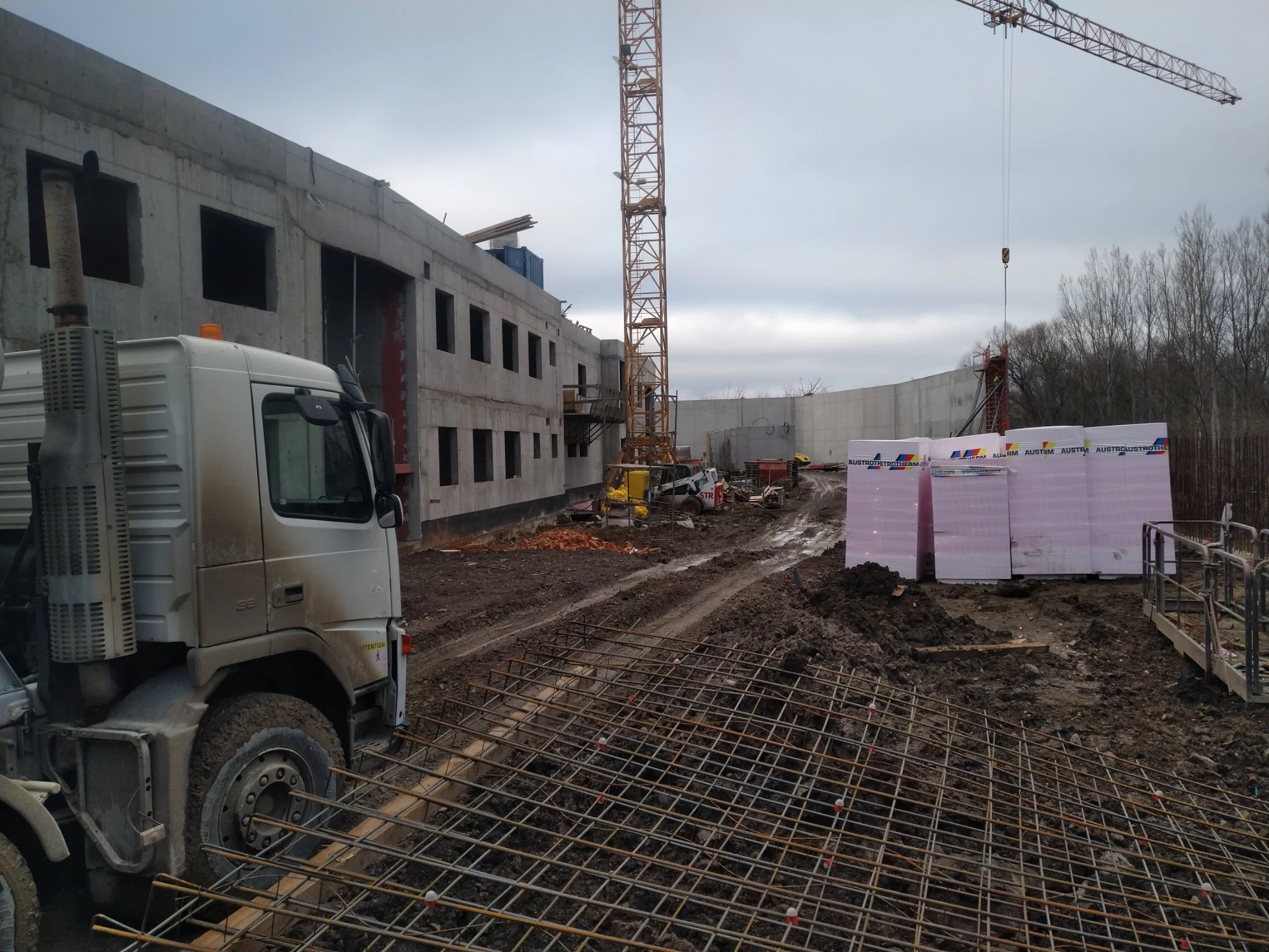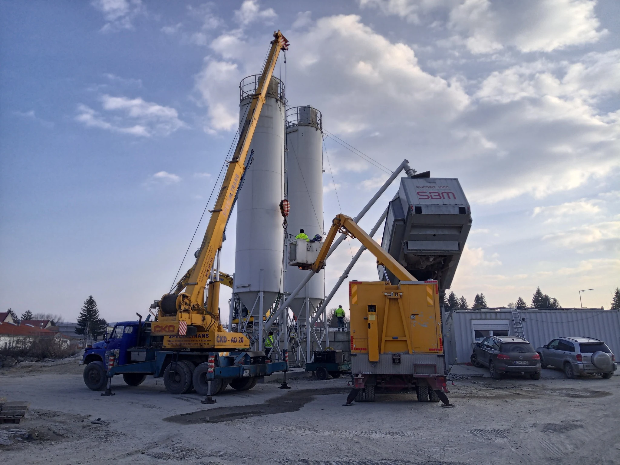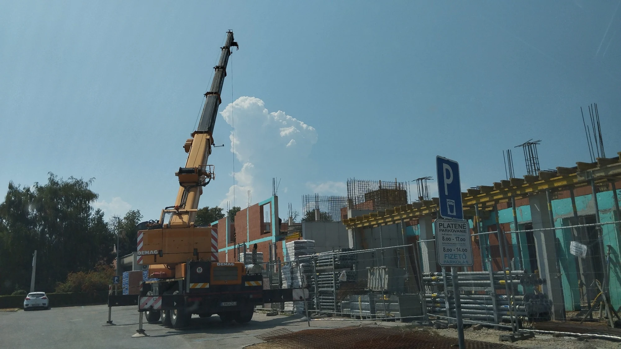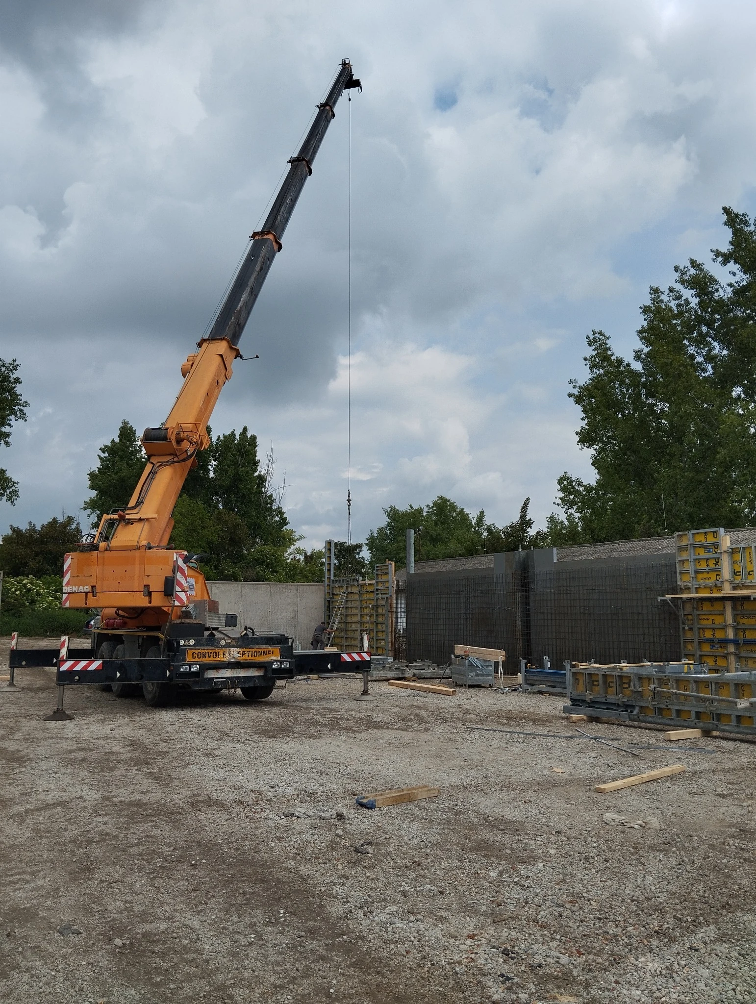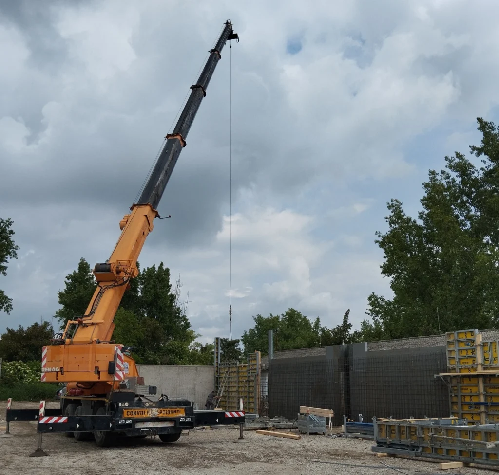 Pre zdvíhanie bremien používame Demag 40t vhodnú na montáž bednenia a ďalšie stavebné úkony.